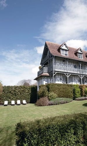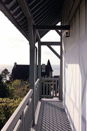 L'histoire de la maison : Belles façades blanches à colombages gris perle, coursives élégantes, bow-windows en ponctuation décorative, le