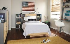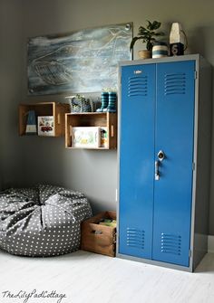 Ici une chambre pour ado confirmé ! Très joli ce mélange de bleu sur l'armoire et ce mur taupe. Les vieilles caisses accrochées au mur forment une bibliothèque originale. L'idée du pouf est aussi toujours une réussite dans une chambre de jeune.