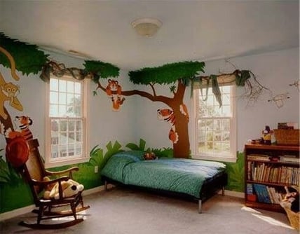 Une chambre jungle. Idéalement une fresque sur le mur est du plus bel effet mais vous pouvez également opter pour des stickers ou un poster géant comme par exemple chez Mr Perswall. Accesoirisez avec des peluches que vous accrocherez à une grosse corde suspendue au travers de la chambre.