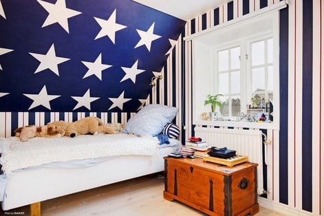 Une classic mais qui plait toujours ... la chambre marin. Utiliser uniquement du blanc, du bleu marine et du rouge. Placer des lignes, que ce soit sur le lit ou sur les tentures ... Effet garantis !