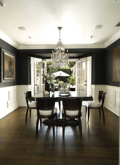 - Associer le noir à des teintes métalliques : très tendance, on associera dans ce cas au mur noir un mur de couleur gris ou argentée. À rappeler ensuite avec des petites touches : moulures stylisées argentées au plafond par exemple, ou en assortissant le mobilier.