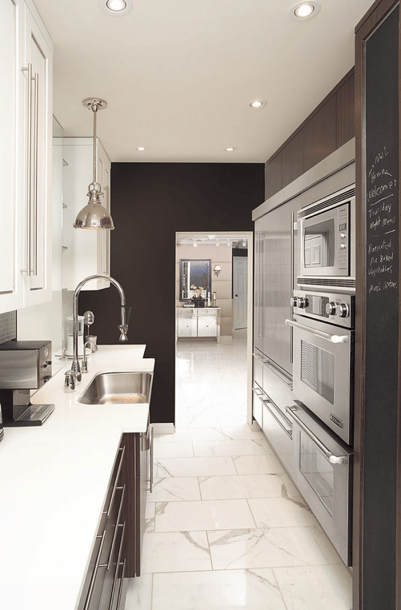 Ici dans cette cuisine le regard est attiré vers ce mur noir, on donne ainsi de la profondeur à cette cuisine qui est longue et étroite.